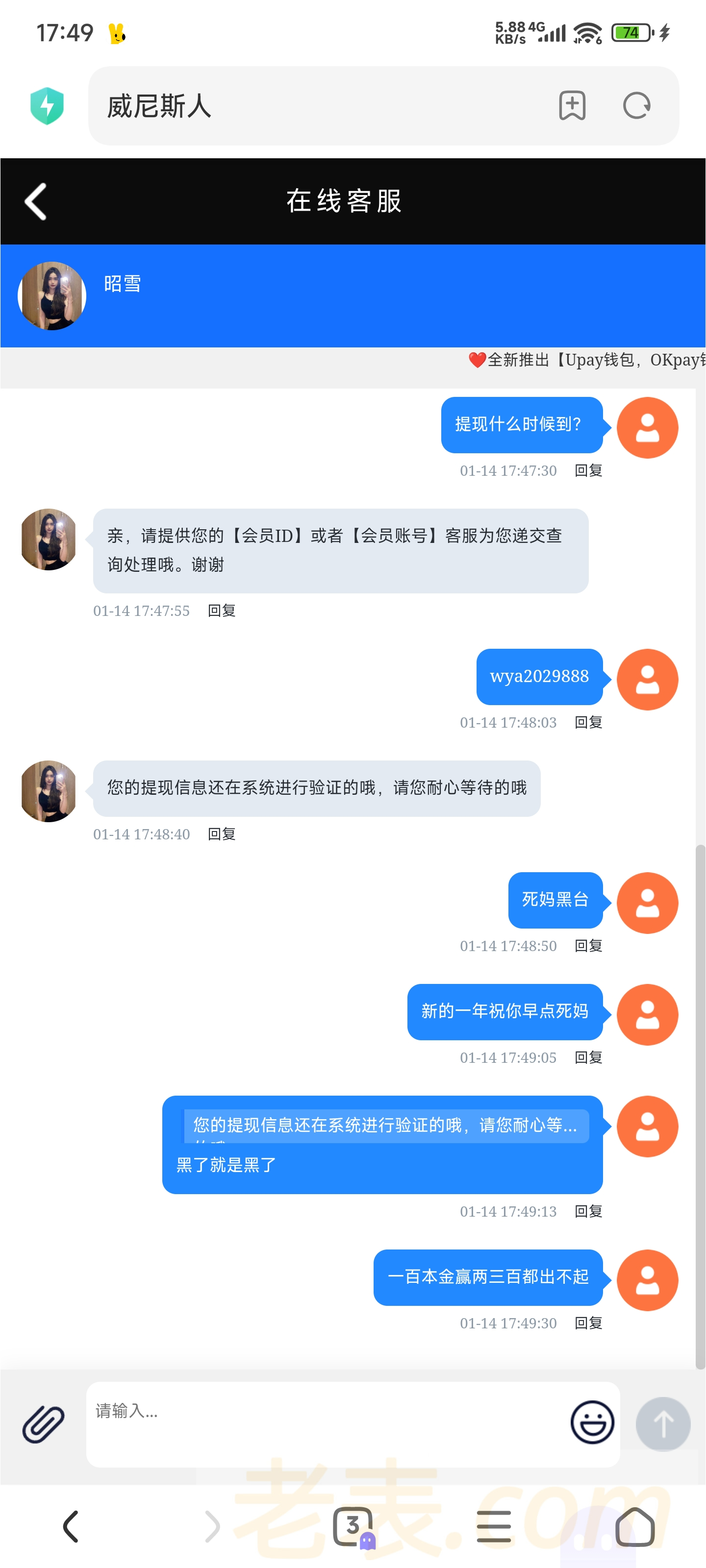 292.cc黑台来的上个月开始提现到现在都没到,一百本金赢了三百多一直提现处理中然后账号又可以登录进去没封就提现一直在处理中,问客服就会一直说系统验证中,每次回都是一句话跟机器人一样,现在的台真的是吃相难看几百块都出不去还在国外搞电诈要是我早就回国打螺丝了